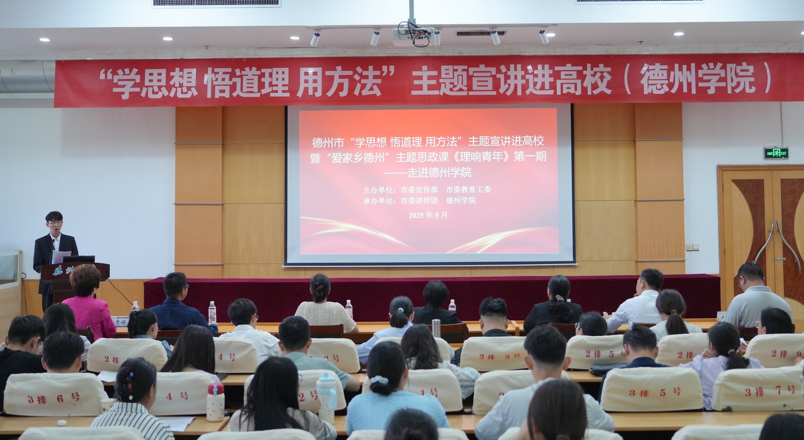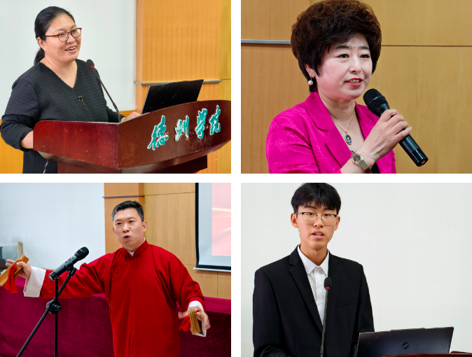 市委党校统战教研部负责人、副教授齐丽梅以《习近平新时代中国特色社会主义思想 开辟马克思主义中国化时代化新境界》为题,从“时代之问与理论之答”“核心要义与实践要求”“历史地位与世界意义”三个维度,系统阐释了习近平新时代中国特色社会主义思想的科学体系。她结合高校育人使命,引导青年学生深刻理解“十个明确”“十四个坚持”“十三个方面成就”“六个必须坚持”的内涵,勉励同学们以“青春之我”践行“强国之志”。德百集团客户经理、全国劳动模范杨秀娟以《小柜台 大舞台》为题,分享基层岗位的奋斗故事,用朴实语言传递“平凡岗位亦能成就非凡人生”的价值理念。德城区新湖街道顺城社区两委委员、青年宣讲团成员、德州学院校友潘士斌以原创快板《比一比》,以传统曲艺形式,将党的百年奋斗历程与基层治理实践相结合,赢得现场阵阵掌声。德州学院大学生宣讲团负责人韩谦益以《到祖国最需要的地方去》为题,结合渤海军区教导旅事迹、北大荒精神、西部计划优秀志愿者事迹讲述新时代青年的使命担当,引发强烈共鸣。