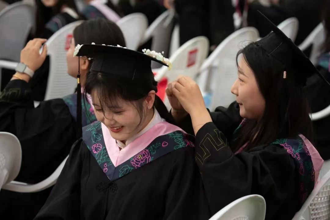 在学位授予仪式环节,党委委员、副校长、学位评定委员会副主席徐静宣读《关于授予2025届毕业生学士学位的决定》,校领导分别到各学位授予台为毕业生拨穗、颁发学位证书并合影留念。