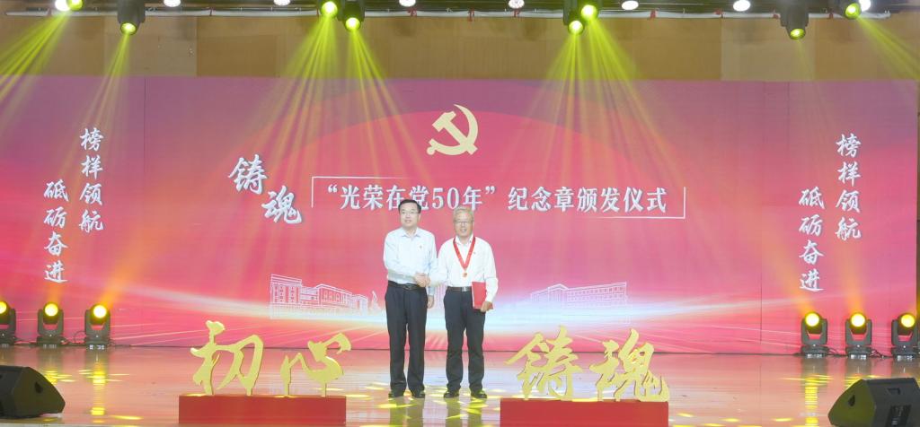 党委副书记、校长赵长林为“光荣在党50年”的老党员代表颁发纪念章。