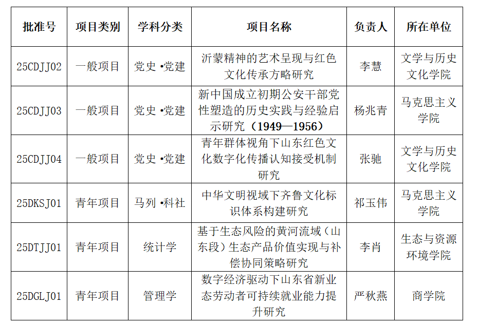 近日,山东省哲学社会科学工作办公室公布了《2025年度山东省社会科学规划研究项目立项名单》,我校共有6个项目获批立项,包括一般项目3项、青年项目3项。此次立项数量在全省15所同类高校中位居前列。