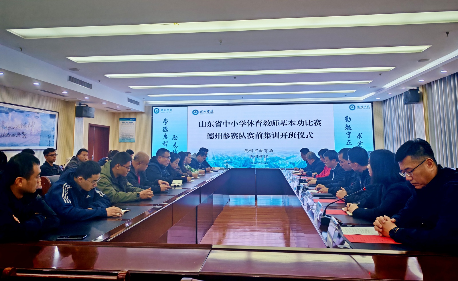 为深入贯彻《教育部关于加强新时代中小学体育教师队伍建设若干举措的通知》精神,切实提升德州市中小学体育教师专业素养与教学能力,10月13日,山东省中小学体育教师基本功比赛德州市参赛队赛前集训开班仪式在厚德楼二楼会议室举行。本次集训由体育学院牵头组织,校党委委员、副校长李甲亮,德州市教育局总督学王亚南,扬州大学体育学院副教授陈晓莺,德州市教育局体卫艺科及德州学院教务处、体育学院相关负责人出席仪式。