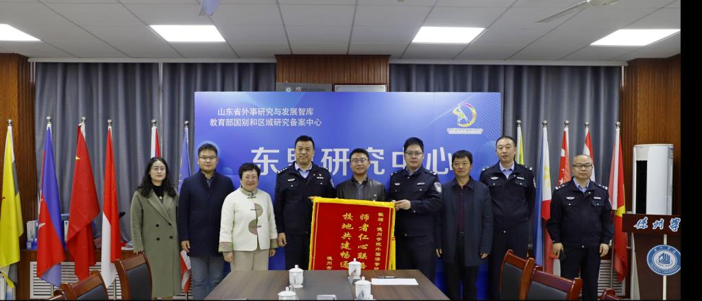 10月31日,德州市公安局陵城分局副局长兰江一行到访德州学院,向东盟研究中心赠送“师者仁心联络专业资源 校地共建畅通译使之路”锦旗。学校党委委员、宣传部部长冯琨参加。