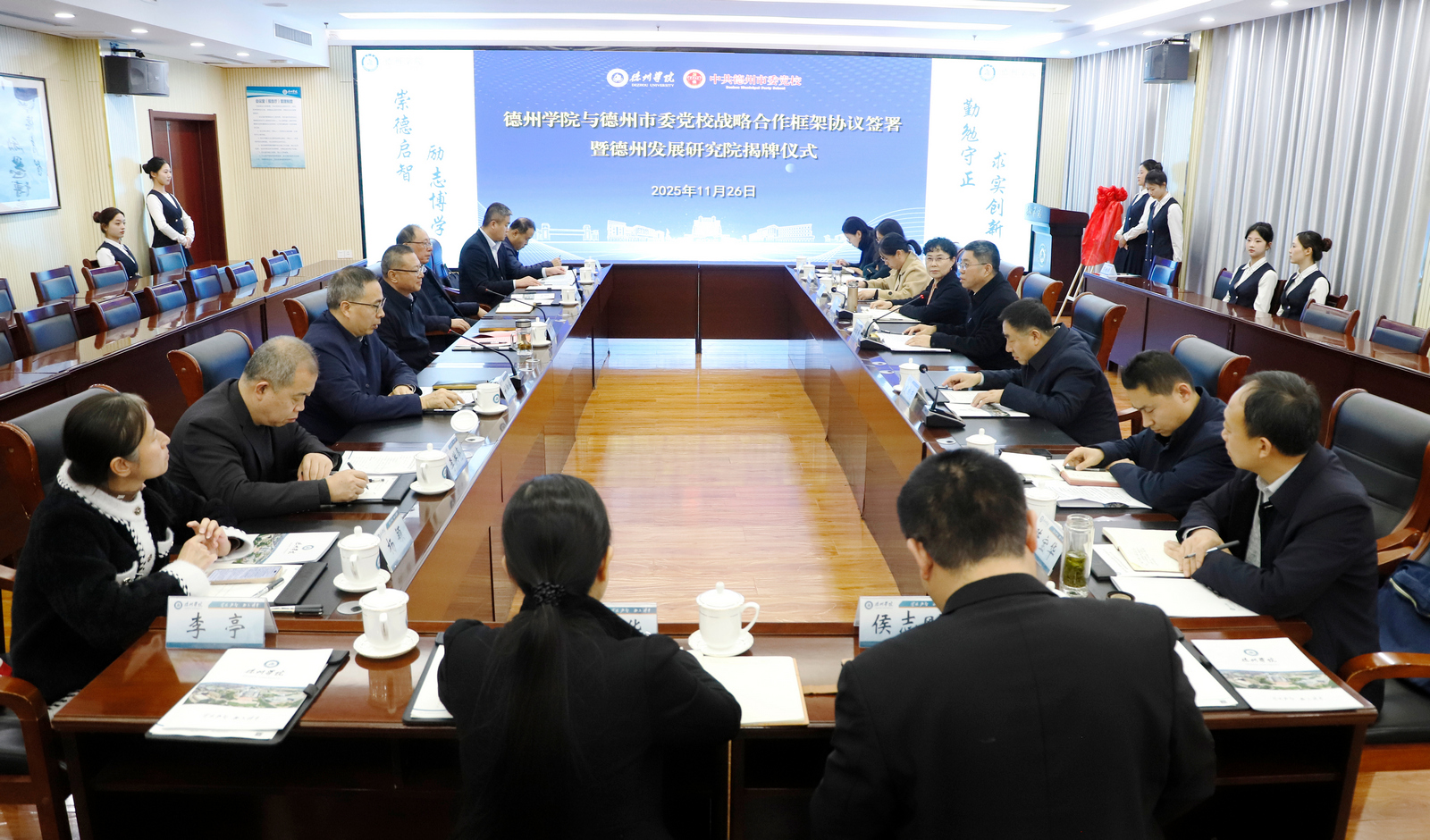 仪式上,吴君书记、刘荣青副校长、史成志主席共同为“德州发展研究院”揭牌。德州学院党委副书记张存峰与德州市委党校副校长王江红代表双方签署了《德州学院与德州市委党校战略合作框架协议》。