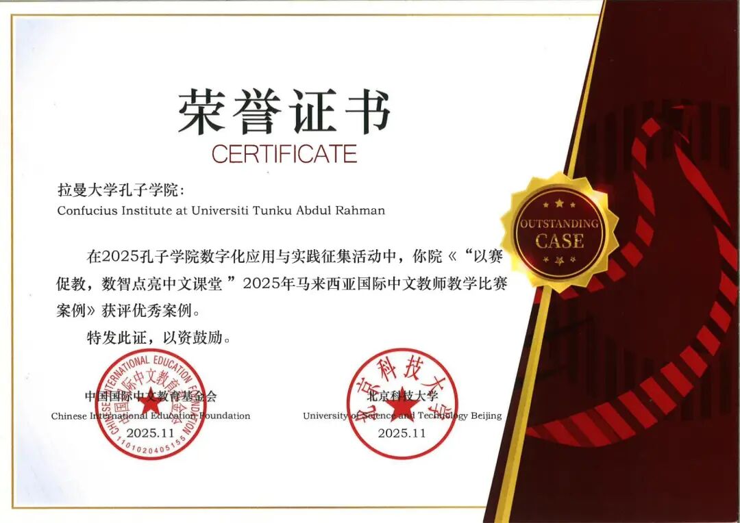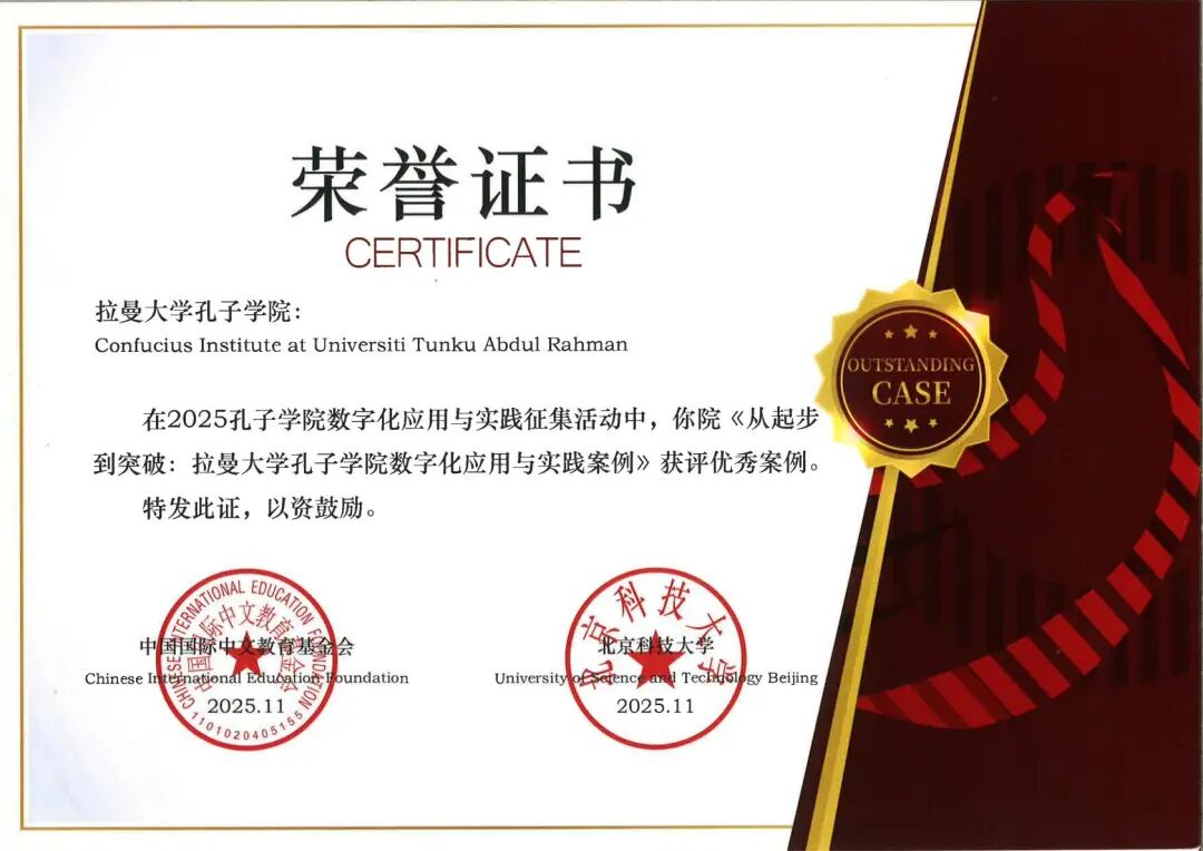 拉曼大学孔子学院自成立以来,积极探索数字化发展路径,将数智技术贯穿于教学改革、赛事支持和文化传播全过程,通过参加“汉语桥”等国际赛事,以及在日常教学工作中融入数字化技术,拉曼大学孔子学院在教学、赛事和传播能力方面快速提升,荣获“全球优秀通讯孔院”称号。孔院学员纪蒂卡同学在“汉语桥”世界大学生中文比赛马来西亚赛区中勇夺总冠军;教师团队在2025年马来西亚国际中文教师教学比赛中荣获冠军,并获“中文+AI创新奖”,展现出了良好的发展潜力。