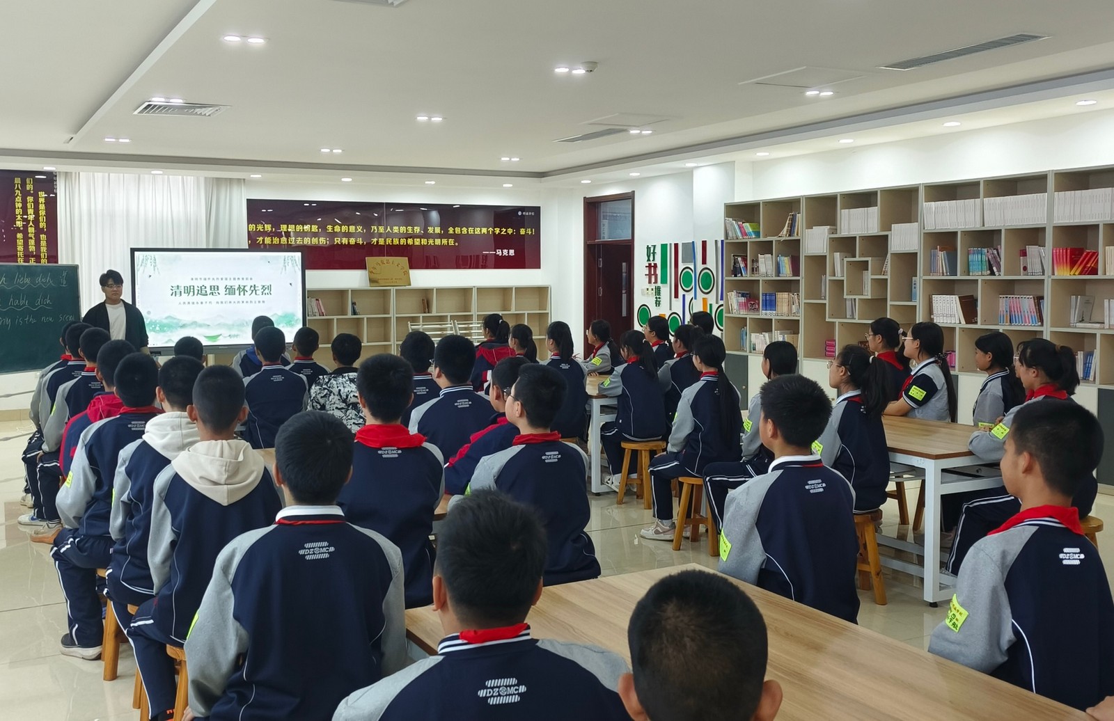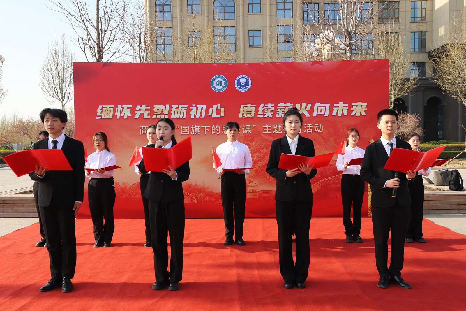 马克思主义学院的“小青马宣讲团”走进明诚学校,创新设计“英烈精神与社会主义核心价值观”对照图谱,将革命精神解码为“10后”的奋斗指南,让红色基因对接青春话语;马克思主义学院学生刘宁活动后感慨道:“传承不是复刻,而是让古老智慧解决今天的问题。”商学院升旗仪式上,师生共学红色历史,以史为鉴传承革命薪火,以国旗下演讲与初心对话会交织成使命担当的强音;教师教育学院的清明诗词朗诵会上,《可爱的中国》响彻礼堂,青年用声音架起连接历史与未来的桥梁。