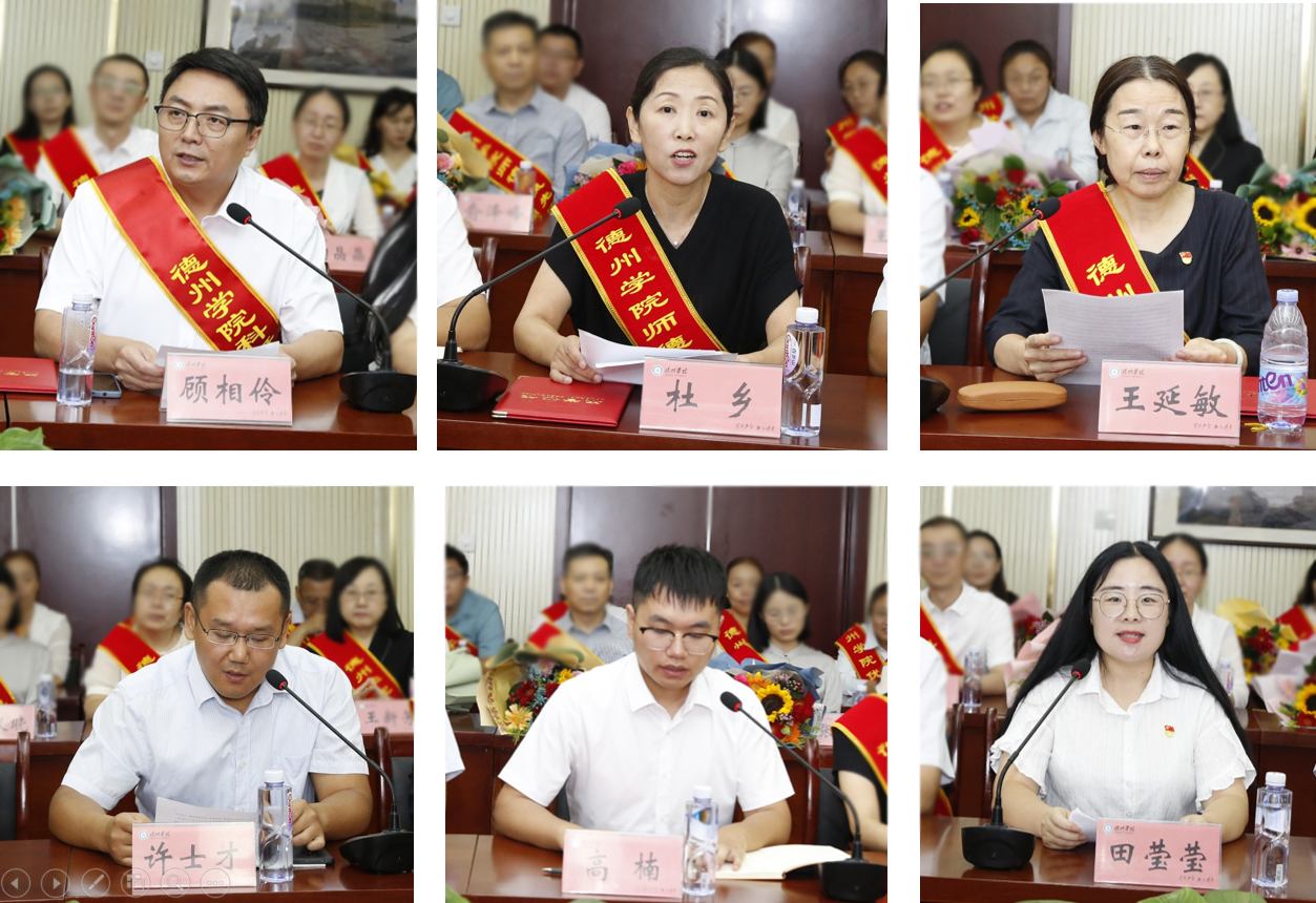 科研工作先进个人、医药与护理学院院长顾相伶,师德师风先进个人、音乐学院教师杜乡,优秀教师、马克思主义学院教师王延敏,优秀教育工作者、生物物理研究院副院长许士才,2023年新入职教师、化学化工学院教师高楠,2022年新入职教师培训结业学员代表、法学院教师田莹莹等教师代表交流发言。