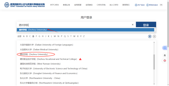 3.通过搜索框或字母导航条,找到“德州学院”;