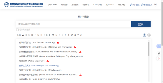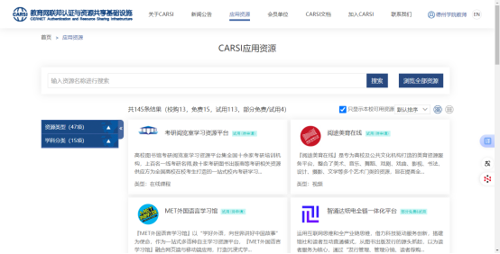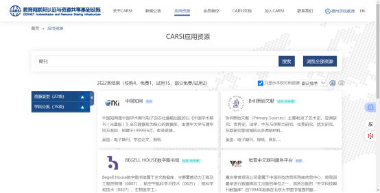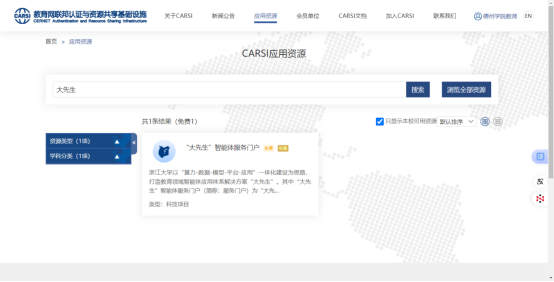 4.进入CARSI门户资源清单页面,在“本校可用资源”中选择或者在搜索框中输入需要的数据库资源。