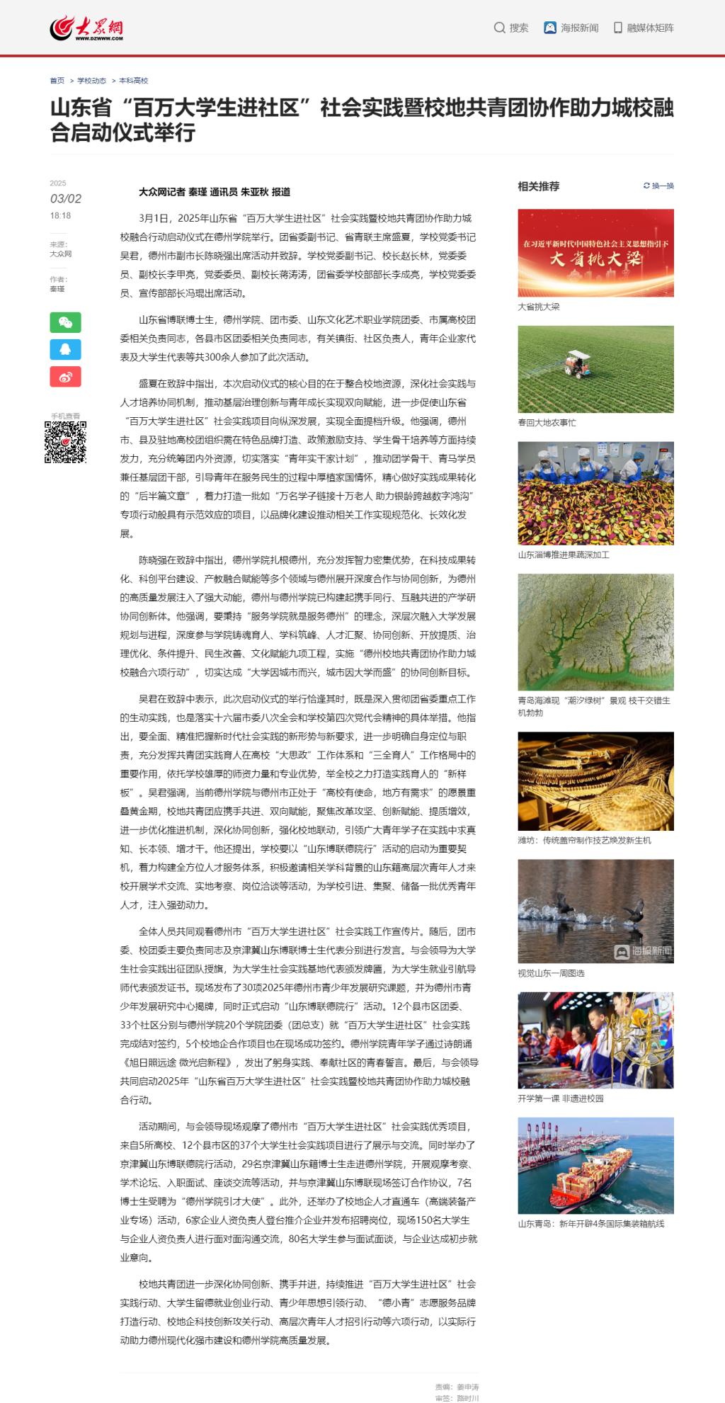【大众网】山东省“百万大学生进社区”社会实践暨校地共青团协作助力城校融合启动仪式举行
