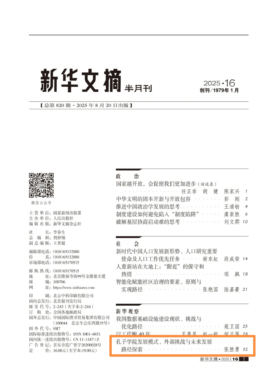 2025年第16期《新华文摘》全文转载德州学院外国语学院张胜勇副教授撰写的《孔子学院发展模式、外部挑战与未来发展路径探索》一文。该论文原发于CSSCI来源期刊《四川师范大学学报(社会科学版)》。论文从区域国别学视角出发,聚焦孔子学院的现有发展模式,重点分析其协同发展、数字化赋能、特色化发展、海外中文教育体系和标准化建设。论文指出孔子学院面临着复杂的社会环境、负面舆情、人员派出难等挑战,孔子学院应通过扩展“中文+职业技能”影响边界、持续优化生态圈、制定本土化发展策略、发展国别研究和建设高端智库等措施进行积极应对。 《新华文摘》由国家新闻出版署主管、人民出版社主办,是大型理论性、综合性、资料性文摘类权威期刊,是我国学术界公认的权威二次文献之一,具有较高的学术地位和广泛的影响力。能被其全文转载的文章,通常被认为是该学科领域的重要成果,其学术价值等同于在顶级期刊发表的论文。